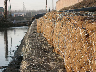 用铅丝石笼网护岸,先要处理铁丝寿数过短的问题。在我国水利工程建设中,铁丝网石笼或钢筋网石笼在暂时工程运用较为遍及,可是,长久建筑物中还没有成功运用的先例,其主要原因是铁丝与水触摸后简单锈蚀,寿数一般在,2~3年之间,达不到水利工程长久建筑物的寿数要求。要在漓江护岸工程中运用低碳钢丝石笼技术,先要寻觅一种在水的效果下不氧化锈蚀的低碳钢丝和运用这种钢丝制造网笼的工艺;其次是要使低碳钢丝石笼护岸与本来的地形地貌相和谐,坚持原有的岸坡形状和天然生长的草木,还美丽的漓江以天然本性。